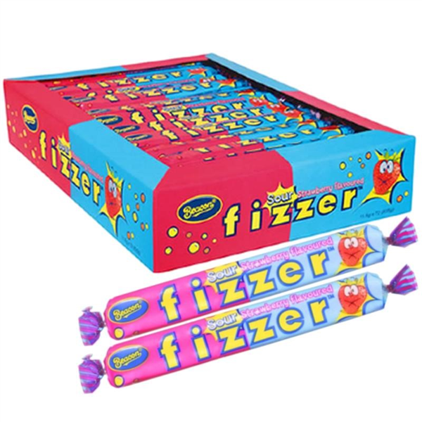 Beacon Fizzer Sour Strawberry. Sour Strawberry flavoured Fizzers are a delicious, fruity and fizzy chewy treat,