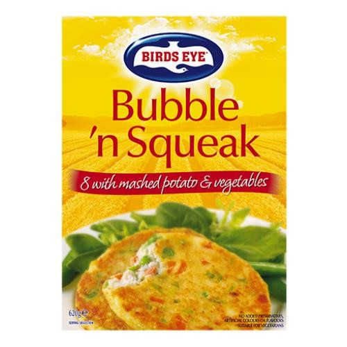 Birds Eye Bubble & Squeak. Suitable for Vegetarians. No added preservatives. No artificial colours or flavours. Size: 620g