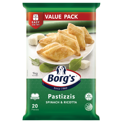 Borgs Pastizzis Spinach & Ricotta are traditional Mediterranean-style pastries filled with a creamy blend of spinach and ricotta cheese, wrapped in Borg’s signature light, flaky pastry.