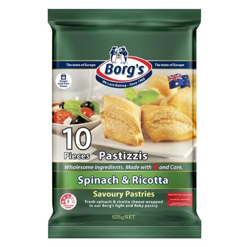 Borg's Pastizzi Spinach & Ricotta. Fresh spinach & ricotta cheese wrapped in our Borg's light and flaky pastry. Size: 625g. Quantity: 10 per pack