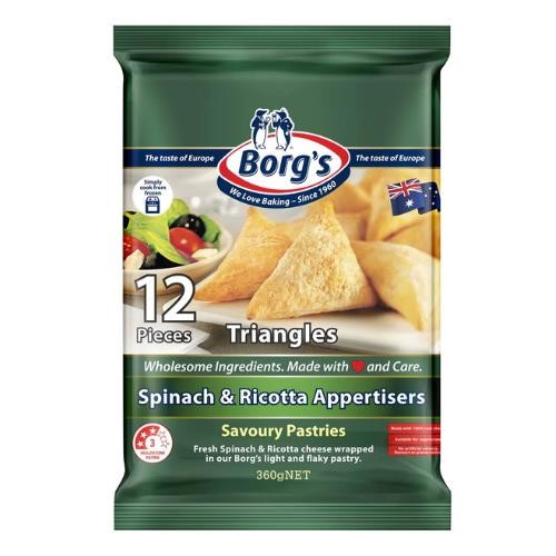 Borg's Spinach & Ricotta Triangles, fresh Spinach & Ricotta wrapped in our Borg's light and flaky pastry. No Artificial Colours, Flavours or preservatives. Size: 360g. Quantity: 12 Per Pack