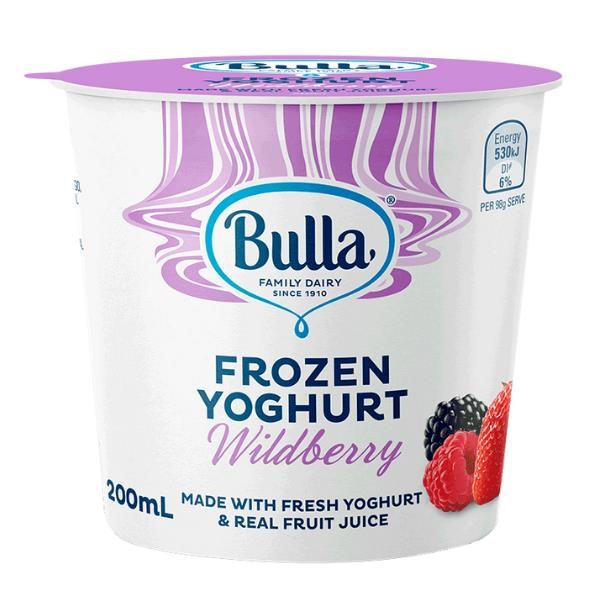 Bulla Frozen Yoghurt cups are made with fresh yoghurt, are 97% fat free and are still free of artificial colours or flavours. Bulla Frozen Yoghurt cups are available in a range of delicious fruity flavours. Contains: Milk and Gluten may have traces of egg. Flavour: Wildberry. Size: 200ml