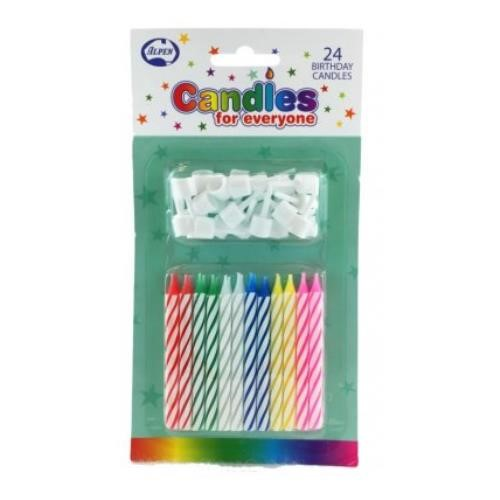 Birthday Candles with Holders. Multi Colour Pattern. Quantity: 24 Candles & Holders Per Pack