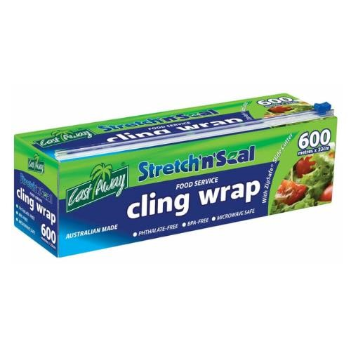 Castaway Stretch’n’Seal cling wrap film offers superior cling, stretch and clarity, sealing in freshness and flavour to maximise shelf life, whilst allowing the contents to breathe. Microwave Safe. BPA Free. Food Safe. Made fron PVC. Australian Made. Zipsafe Slide Cutter. Phthalate free. Size: 600m x 33cm