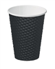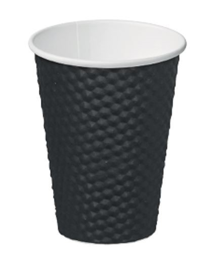 Black Dimple Paper Hot Cup. with insulating air pockets. Black. Size: 12oz. 355mL. Qty: 25 per sleeve. 500 per carton. Item: CA-DMPL12-BLK.