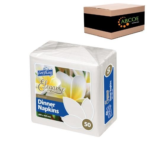 Castaway Elegance Dinner Napkins offer the ultimate in quality, coverage and absorbency. An ideal solution for restaurants, formal dining, events, home delivery and catering. Choose from a wide range of folds and colours. Australian Made. Quarter Fold. Dimensions: 200mm x 200mm (folded) and 400mm x 400mm (open). Colour: White. Quantity: 500 Per Carton