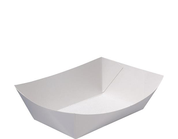 RediServe Paper Food Trays #3. Poly-Lined. White. Size: Medium. 210 x 140 x 55 mm. Qty: 125 per sleeve. 500 per carton. Item: CA-TR3-W. Australian made in HACCP certified facilities. Build your brand by custom printing these products. Paper from managed plantation forests. Poly-lined to resist liquid & grease. Pre-assembled for speedy service. Tapered design for easy stacking.