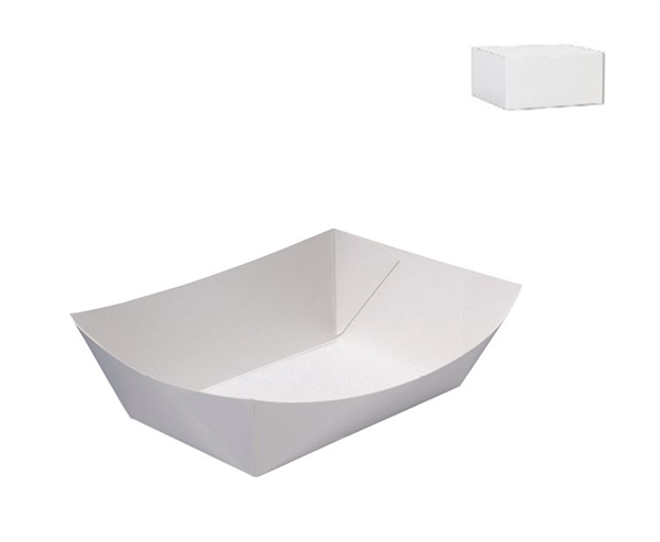 RediServe Paper Food Trays #3. Poly-Lined. White. Size: Medium. 210 x 140 x 55 mm. Qty: 125 per sleeve. 500 per carton. Item: CA-TR3-W.