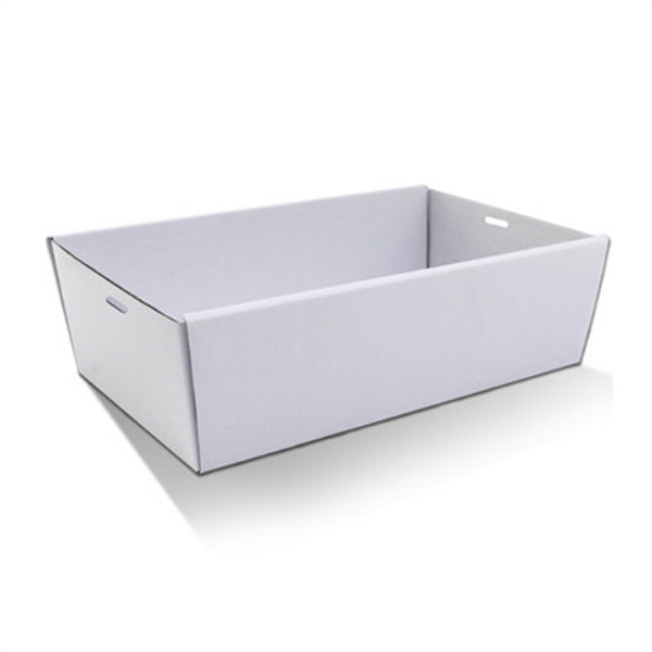 Catering trays / white corrugated. Sturdy and durable catering tray, excellent option for gourmet catering. Made from white corrugated cardboard, flat packed for better storage, easy assembly. Matching transparent lids make it easy to showcase the products, and you can stamp your logo on the slide-on sleeves. Please note, that matching lids and sleeves are sold separately. Matching lids WCTLM or CTLM.
