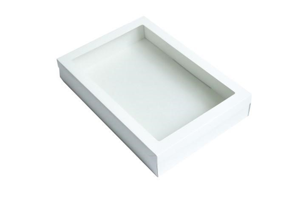 Made from white paper with a clear plastic window, these catering boxes are not only environmentally friendly but also stylish and sleek looking. Able to transport most types of food such as bread, pastries, fruit or cheese. Size: 450mm X 310mm X 80mm. Comes with lid, flat packed, customer to make up.