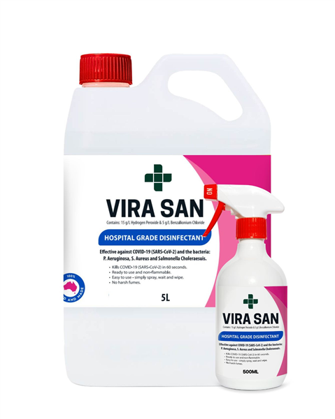 VIRA SAN has been proven to kill COVID-19 (SARS-CoV-2) in 60 seconds. Australian Register of Therapeutic Goods for COVID-19 claim (ARTG No. 340431). The synergy between Hydrogen Peroxide and Benzalkonium Chloride is an effective way to mitigate the threat of COVID-19, germs and bacteria (S. aureus, Pseudomonas aeruginosa, Salmonella choleraesuis). Vira San is safe to use on almost all hard surfaces including but not limited to; glass, plastic and stainless steel. Easy to use, simply spray, wait and wipe. Effective sanitisation within 1 minute. Formulated and developed in line with guidelines published by the World Health Organisation (2020).
