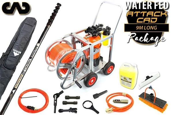 • Includes BRILLIANT NEW 100% carbon, non-round Aero CAD Attack 9 m pole, 12.5 L GO H2O Pro DI on all-in-one trolley with detergent dispenser, removable compact hose reel & 80 m hose