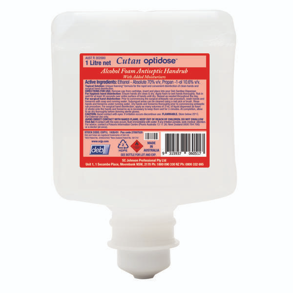 Cutan Optidose Alcohol Foam Sanitiser. A highly effective alcohol foam antiseptic handrub that helps hospitals keep patients safe and improve hand hygiene compliance with just ONE PUSH. Contains conditioners to help prevent skin dryness and leave the skin feeling soft and smooth for an excellent after feel. Unique foaming formula for the rapid and convenient disinfection of hands and surgical hand disinfection.. Size: 1L. Quantity: 6 Pods Per Carton
