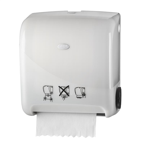 . Single-sheet dispensing improves hygiene and reduces waste. Reduces paper costs by more than 30%. Designed exclusively for Jaws 200m Hand Towel. High capacity means fewer roll changes in busy washrooms. Strong construction with a modern white finish