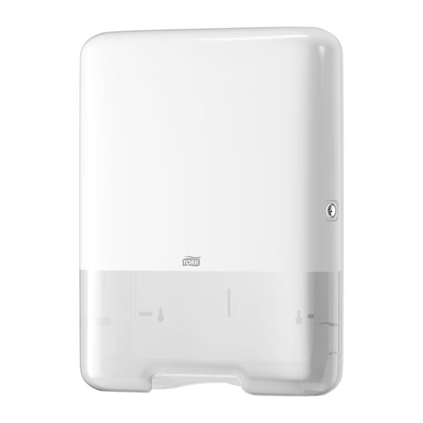 is a strong and reliable high-capacity dispenser designed for busy washroom environments. Its hygienic touch-free design ensures users only touch the towel they use, helping to reduce waste and improve cleanliness. The flexible refilling system allows for easy and convenient top-ups, while the translucent front window makes it simple to check stock levels at a glance to avoid unexpected run-outs. An innovative locking system offers the option to open with or without a key, providing added flexibility for maintenance staff. Made from durable plastic with a clean white finish, it blends seamlessly into professional washrooms. Measuring 333mm(W) x 439mm(H) x 136mm(D), it is part of the Tork H3 system for singlefold hand towels