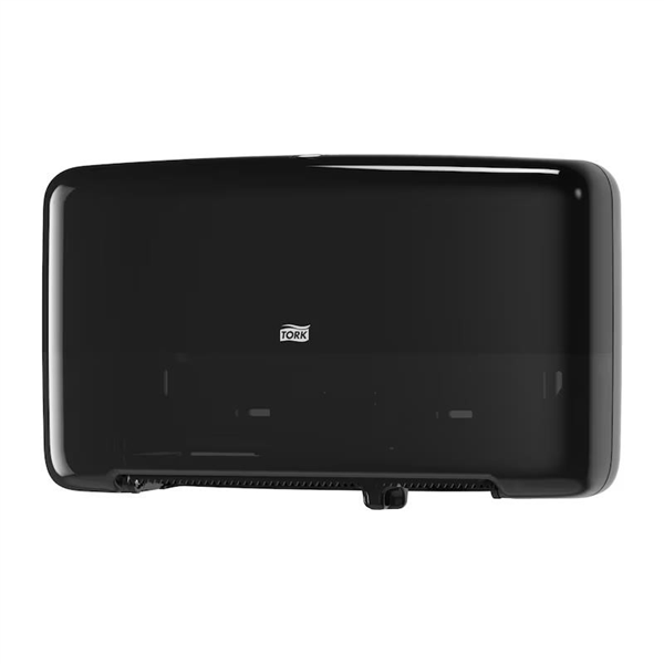 PRODUCT DESCRIPTION. Dispenser Tork Toilet Roll Twin Mini Jumbo Black T2 is a premium, high-capacity dispenser designed for high-traffic washrooms, offering both efficiency and a modern appearance. Part of the sleek Tork Elevation range, it holds two full mini jumbo rolls to ensure paper is always available, reducing the risk of shortages and lowering maintenance time. Its smart design allows both rolls to be completely used, minimising waste, while the optimal roll brake prevents free-spinning to control consumption. A clear see-through window provides a quick view of paper levels, making refills easy to plan. With its functional, stylish black finish, this dispenser creates a professional impression while delivering reliable performance