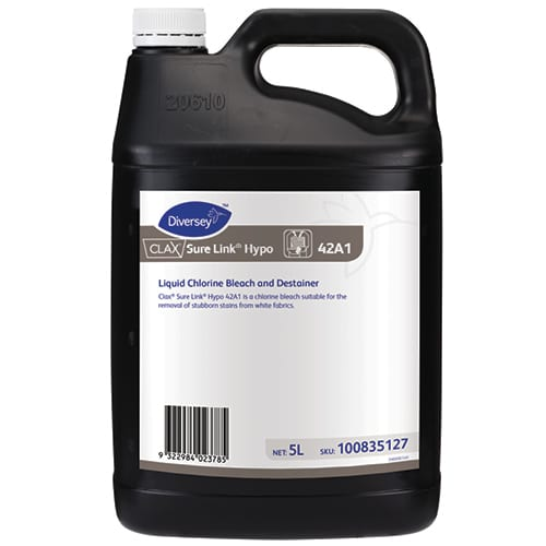 Diversey Clax Sure Link Hypo 42A1 5L (2/CTN) is a chlorine-based laundry bleach designed for use in professional automatic dosing systems.