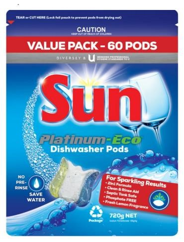 PRODUCT DESCRIPTION. Diversey Sun Platinum Dishwasher Tablets is designed to deliver exceptional grease-cutting and stain removal power while being gentle on the environment. Each dissolvable tablet is wrapped in a water-soluble film and features a built-in rinse aid for a brilliant, streak-free shine on glassware, cutlery, crockery, pots, and pans. Packaged in a convenient flip-top container, these tablets are phosphate-free, perfume-free, and dye-free—safe for septic systems and environmentally responsible