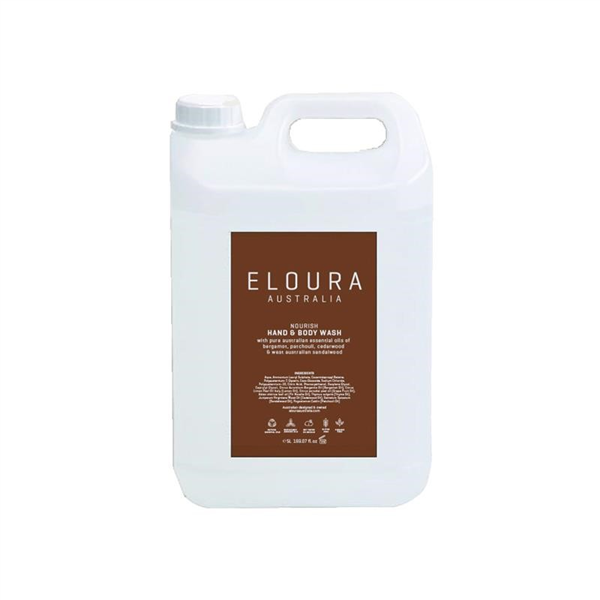 Eloura Nourish Hand & Body Wash is ustainably sourced, vitamin rich pure Australian essential oils of bergamot, patchouli, cedarwood and West Australian sandalwood, in a unique formula that balances nature and science to clean and soothe the skin. Naturally aromatic and free of chemical fragrance. Size: 5L