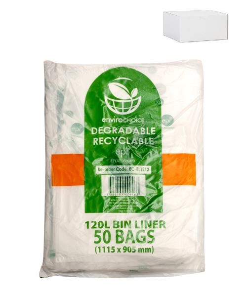 Size: 120 litres, 1115x905mm, to suit small wheelie bin. Manufactured using EPI’s OXO-Biodegradable additive technology, the Envirochoice bin liner provides a degradable yet strong bin liner. Envirochoice bin liners are better for our environment than conventional liners as the EPI technology allows the product to be recycled, yet degrade when exposed to heat and sunlight if not recycled.