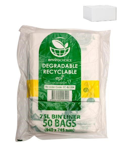 Size: 75 litres, 940x745mm, to suit large, round garbage bin. Manufactured using EPI’s OXO-Biodegradable additive technology, the Envirochoice bin liner provides a degradable yet strong bin liner. Envirochoice bin liners are better for our environment than conventional liners as the EPI technology allows the product to be recycled, yet degrade when exposed to heat and sunlight if not recycled.
