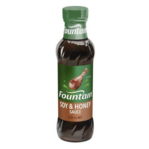 Fountain Soy and Honey Sauce, Max out the flavour of your meals with Fountain Soy & Honey Sauce. Great as a marinade, dipping sauce or in stir fries. Made with no added flavours, Fountain Soy & Honey Sauce makes a delicious marinade for chicken wings or drumsticks, and is great as a dipping sauce for spring rolls and kebabs too. Contains: Soy, Sulphites, Peanuts, Wheat, Gluten. Size: 250ml