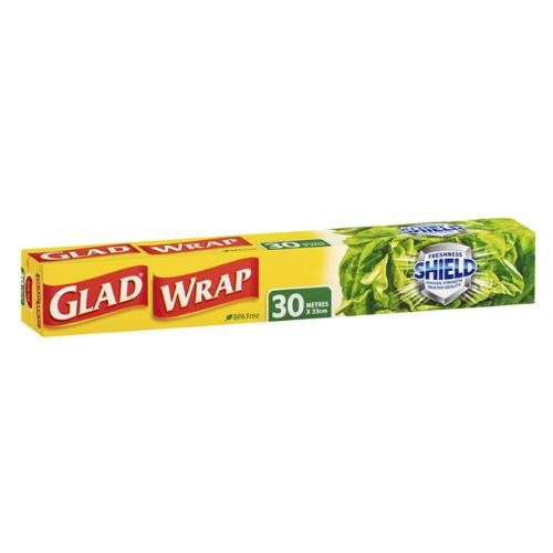 Glad Wrap provides longer lasting freshness with proven strength. Clings tight and seals easily to protect and preserve prepared food. The Freshness Shield and the easy to dispense system make covering and portioning food fast and simple. BPA free and made from non-toxic polyethylene, it is perfect for reheating food in the microwave and great for wrapping food for freezer storage. Just click in the secure side core lock tabs to activate the dispensing system and rely on Glad Wrap's proven strength and trusted quality to keep your food fresh. Prepare, Protect & Portion. BPA Free. Microwave & Freezer Safe. Size: 30m x 33cm.