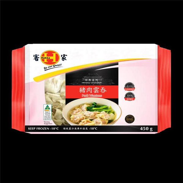 Hakka Pork Wontons, these delicious wontons contain tender premium cuts of pork marinated with an authentic blend of soy sauce, sesame oil and seasoning. Contains: Gluten, Sesame, Molluscan Shellfish, and Soy. Servings: Approx 30 pieces. Size: 450g