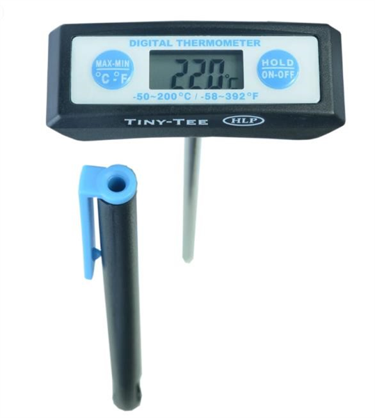 Tiny-Tee: Food Grade Stainless Steel, Digital Probe Thermometer - Waterproof - 'T' shaped so that the digital display is facing upward when the probe is in the product. Temperature range from: -50°C up to 200°C