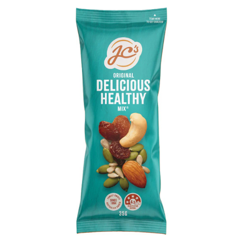 JC's Healthy Nut Mix is a healthy mix of sultanas, almonds, sunflower kernels, pepitas and cashews that is sure to delight your taste buds. These nourishing specimens are great in homemade granola bars and healthy slices. Use as a topping for your favourite porridge, muesli or yoghurt. Perfect for popping in lunch boxes and hand bags. Contains: Tree Nuts and may also contain peanuts, other tree nuts, milk, gluten, soy, sulphites and sesame seeds. Size: 35g. Quantity: 21 x 35g packs per carton