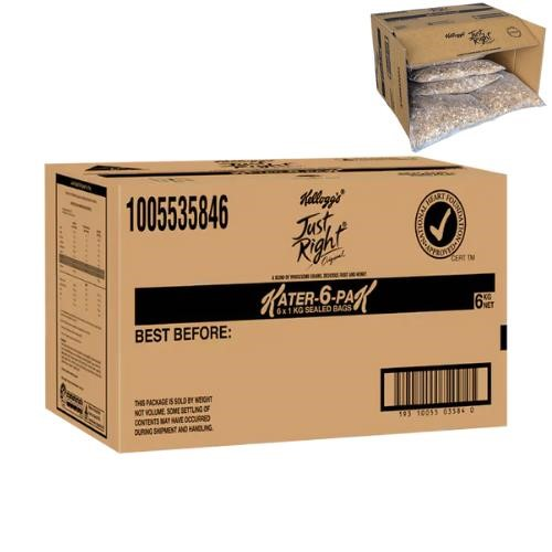 Kelloggs Just Right is a blend of wholesome grains and has sultanas and apricot pieces that feels just right for the start of the day. It is high in whole grains and fibre, low in salt, has B vitamins and iron, so you know that you are giving yourself a nutritious breakfast cereal. Why not mix Kelloggs Just Right® with your favourite creamy yoghurt – Yum. Size: 1kg Bags. Quantity: 6 x 1kg bags per carton