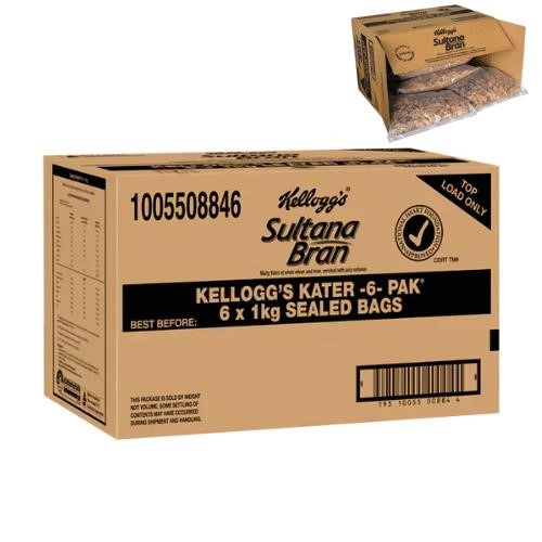 Kelloggs Sultana Bran is a delicious high fibre cereal with malty flakes of whole wheat and bran plus juicy sultanas. Sultana Bran contains more fibre than 2 slices of wholemeal toast. Kellogg's Sultana Bran is a great way to start the day off right. Size: 1kg Bags. Quantity: 6 x 1kg bags per carton