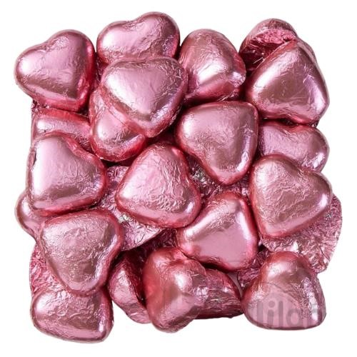 . Pink foil wrapped, heart shaped milk chocolate. Size: 500g. Colour: Pink