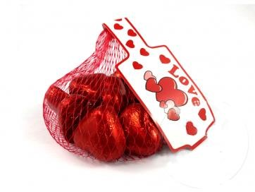 . Red foil wrapped, heart shaped milk chocolate in a mesh net