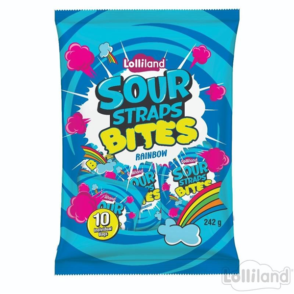 Rainbow coloured, fruit flavoured, mini sour straps with a light sugar coating