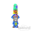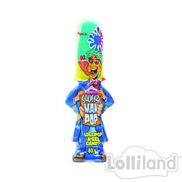 Novelty figurine shaped, fruit flavoured lollipop with squeezable gel candy that comes out of the head