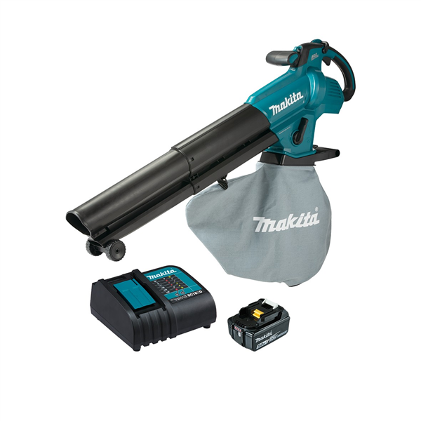 KEY BENEFITS. Includes 5.0Ah battery and charger for complete kit setup. Powerful 230km/h blowing speed and high vacuum air volume. Brushless motor for extended tool life and efficiency. Built-in mulching function reduces waste with shredder blades. Easy switch between vacuum and blower modes. Ergonomic design with strap and wheels for user comfort