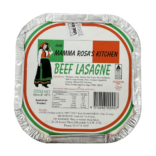 Mamma Rosa Beef Lasagne is a convenient 220g single-serve frozen meal, delivering a classic Italian-style dish in a compact, ready-to-eat format.