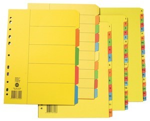 Marbig dividers are made from reinforced manilla board with plastic reinforced tabs and binder strips for durability and longer life. | Ideal for a unique look to presentation indexing | All tabs are printed, except 5 and 10 tab | Available in a range of bright colours