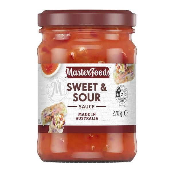 Discover MasterFood Sweet & Sour Sauce, a tasty and convenient dipping sauce. A delicious blend of tomatoes, chopped onions, crisp capsicum, fresh carrots, sweet juicy pineapple and a sprinkle of aromatic spices. Pairs well with all meats, especially with pork, chicken, fish and seafood. For something different, add to your crunchy stir-fry's for a boost of flavour. Australian made. No artificial colours or flavours. Contains: Peanuts may be present. Size: 270g
