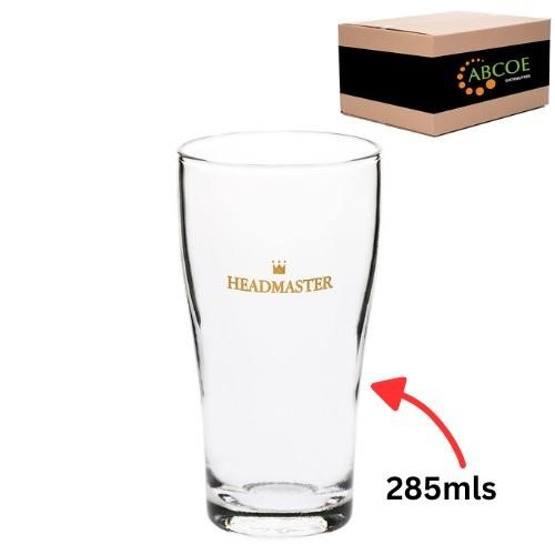 Middy 285ml Conical Headmaster. The iconic beer shape of the industry. The Crowntuff toughening process makes this beer glass up to six times stronger than the standard Conical. Featuring weights and measures marking these beer glasses are suitable for draught beer usage. Nucleated Base. Dimensions: 130mm Height x 70mm Diameter. Capacity: 285mls. Quantity: 48 Per Carton