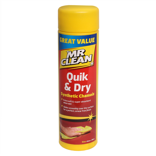 Mr Clean Quick & Dry Cylinder Chamois is a synthetic, high-absorbency drying cloth designed to remove water and moisture from vehicles, windows and other hard surfaces.
