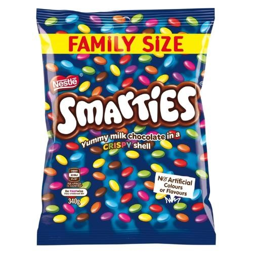 . Colourful confectionery tasty treats of smooth milk chocolate covered in a colourful crisp sugar shell packaged in a share bag. Smarties contain no artificial flavours, colours or preservatives, it's a treat you can feel happy to give. Size: 340g