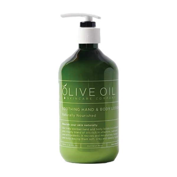Olive Oil Skincare Hand & Body Lotion . Nourish your hair naturally. The lively scented Olive Oil Skincare Hand and Body Lotion is a smooth and creamy blend of oils rich in vitamins, nutrients and antioxidants. Quickly absorbed, it revives and moisturises hands and body leaving them soft, silky and deeply hydrated. Australian Made. Code: OLV-PSBL-500. Size: 500ml