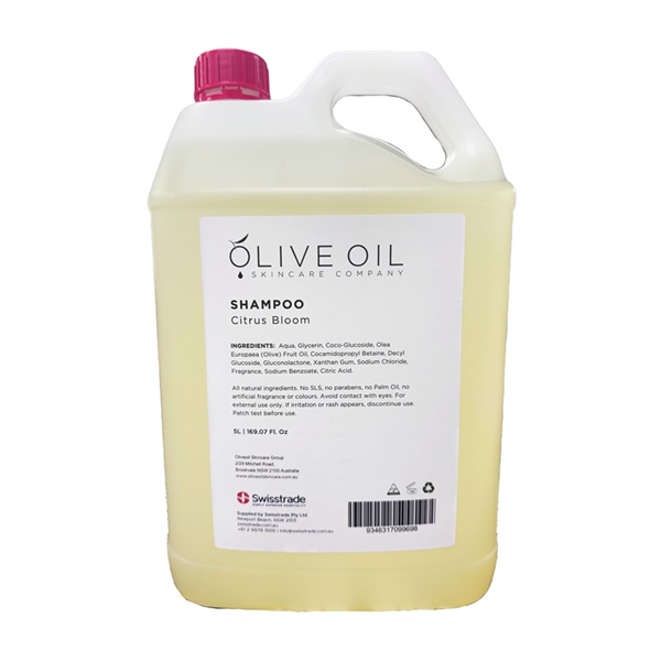 Olive Oil Skincare Shampoo Citrus Bloom. Nourish your hair naturally. Ideal for both oily and dry hair, this Citrus Bloom Shampoo helps to moisturise and nourish the hair, providing healthy shine and volume. Australian Made. Code: OLV-PSHS-5L. Scent: Citrus Bloom. Size: 5L