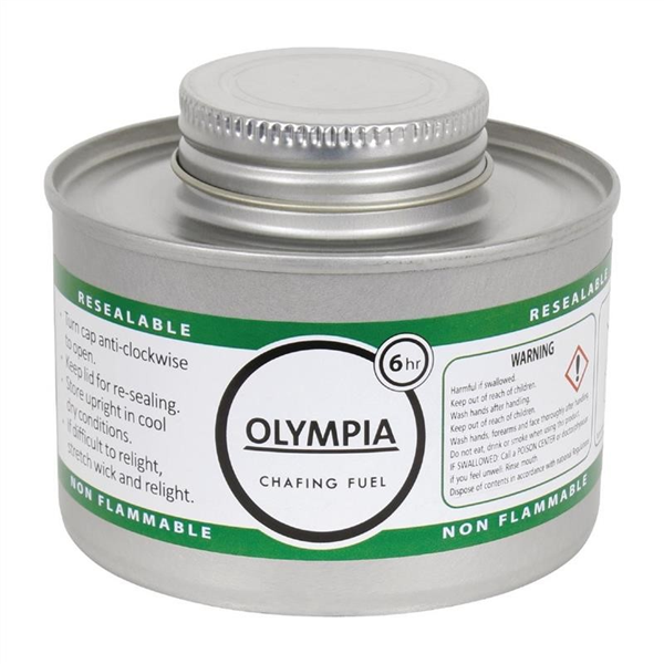 Innovative design and features combine to make the 6 hour Olympia chafing fuel the safer option. It features non-hazardous fuel with internal reservoir to help prevent spillage if knocked over. For additional safety, the fuel is non-flammable without the wick and is non-combustible (has no flash point). A visible flame helps to avoid accidental injury for added user safety. When alight the container will not become hot to-touch, reducing burn injuries.