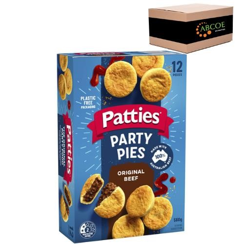 Patties Party Beef Pies a dozen of our famous party pies made with 100% beef in flavoursome gravy encased in flaky golden pastry. Every freezer should have one of these inside. Always. Contains: Gluten and Soy may contain traces of Milk. Size: 12 per pack. Quantity: 6 x 12packs per carton