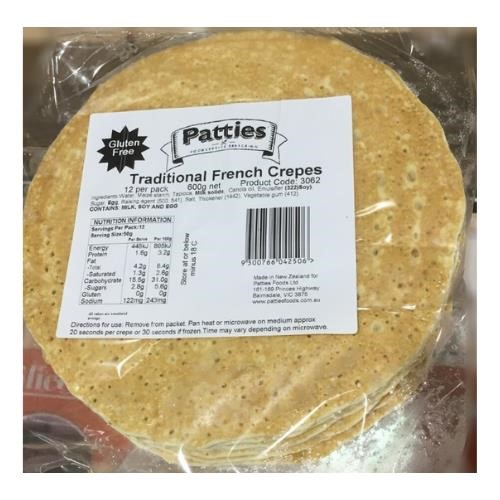 Patties Traditional French Crepes are perfect for sweet or savoury dishes. Simply defrost and serve hot or cold. Gluten Free. Size: 12 per pack