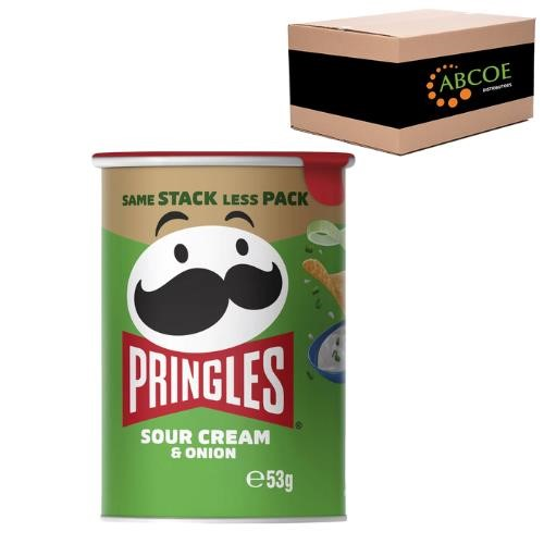 . Pringles Sour Cream & Onion salted stacked potato chips are deliciously crisp potato chips. It's the ideal savoury snack for a barbecue, picnic or party. Size: 53g. Quantity: 12 carton