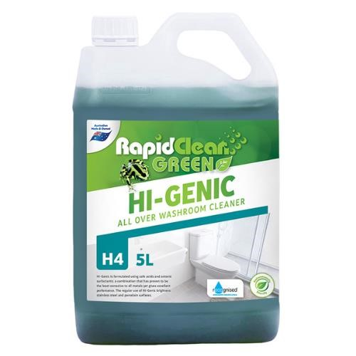 RapidClean Hi-Genic Washroom Cleaner can be used safely on a wide variety of surfaces including stainless steel and porcelain toilet bowls, urinals and stone bench tops. HI-GENIC incorporates a blend of natural organic acids and wetting agents combined with a specially formulated thixotropic agent. The acidic detergency provides a rapid penetration and dissolution of lime scale deposits, uric acid deposits and stains, whilst the thixotropic characteristics ensure that the thickened liquid has an extended contact time by “sticking” to all vertical surfaces. Available in 5 Litre or 15 Litre or 500mL Empty Spray Bottle